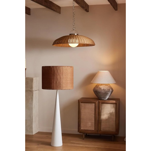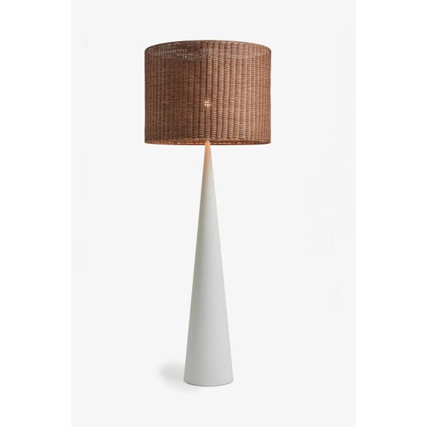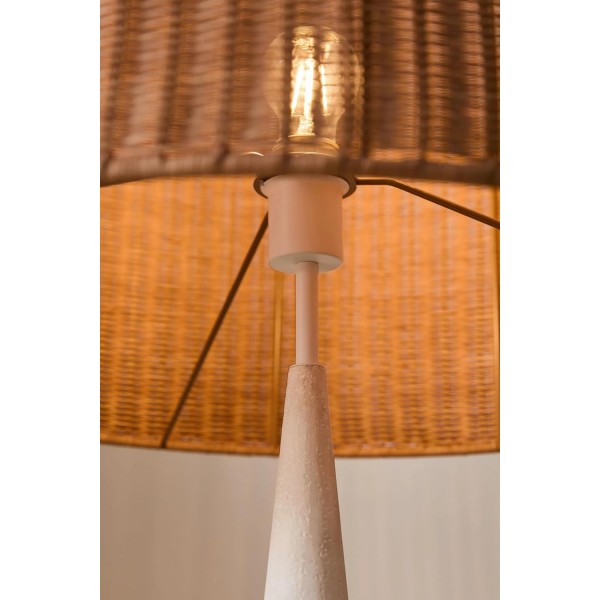 Ivory Floor Lamp Features a Plaster Finish Base and a Hand Woven Rattan Shade.